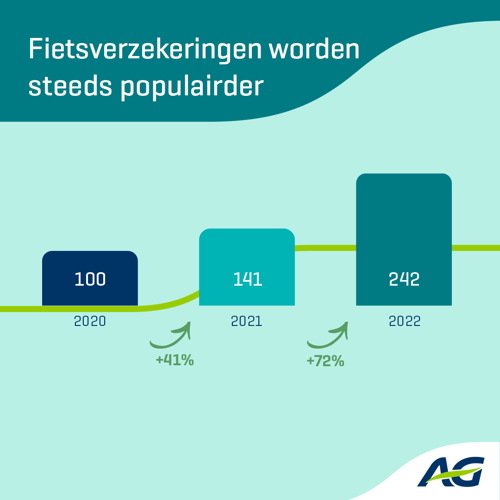 De opkomst van nieuwe en steeds duurdere fietsmodellen jaagt ook de vraag naar fietsverzekeringen de hoogte in. Bij AG is het aantal fietsverzekeringen op 2 jaar tijd meer dan verdubbeld. Klanten willen zich vooral beschermen tegen het risico dat hun fiets gestolen zou worden. Een analyse van de diefstaldossiers bij AG leert dat dit vooral een grootstedelijk fenomeen is. Zo is de kans dat je fiets gestolen wordt in Brussel maar liefst 4 x groter dan het landelijk gemiddelde, terwijl ook Antwerpen en Leuven niet goed scoren.
